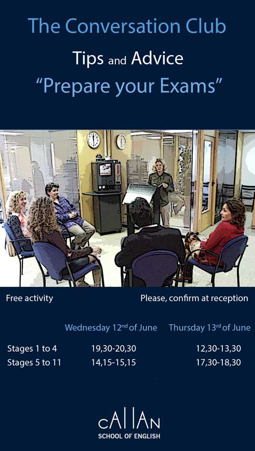 Tots els alumnes de Callan School poden preparar els seus exàmens, dels Cursos d’Anglès, en les sessions que hem organitzat al nostre proper Club de Conversa: “Tips and Advice. Prepareu your exams”.