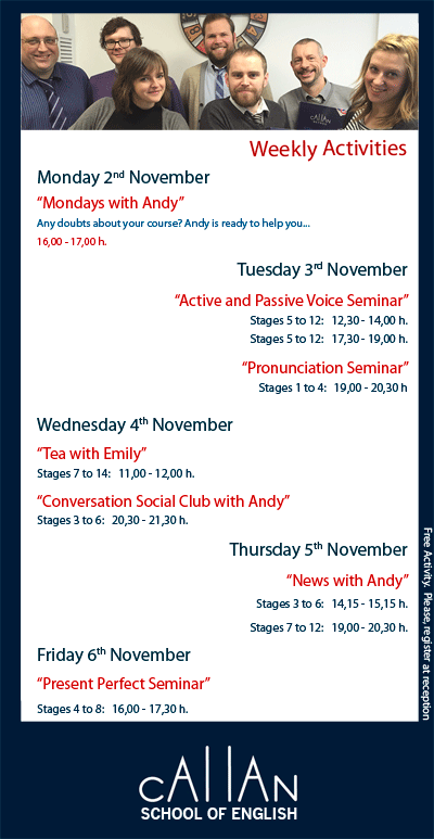 Tuesday, 3rd of November “Active and Passive Voice Seminar” Stages 5 to 12: 12,30 – 14,00 h. Stages 5 to 12: 17,30 – 19,00 h. “Pronunciation Seminar” Stages 1 to 4: 19,00 – 20,30 h. Wednesday, 4th of November “Tea with Emily” Stages 7 to 14: 11,00 – 12,00 h. “Conversation Social Club with Andy” …