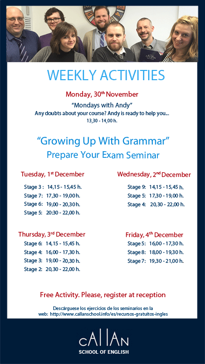 “Growing up with grammar. Prepare your exam Seminar” Tuesday, 1st of December Stage 3: 14,15 – 15,45 h. Stage 7: 17,30 – 19,00 h. Stage 6: 19,00 – 20,30 h. Stage 5: 20,30 – 22,00 h. Wednesday, 2nd of December Stage 9: 14,15 – 15,45 h. Stage 5: 17,30 – 19,00 h. Stage 4: 20,30 …