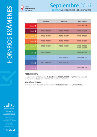 Las notas le serán remitidas por correo electrónico. Si desea revisar su examen podrá hacerlo el viernes 30 de Septiembre de 13,00 a 19,00 h. En el caso de que no supere el examen, se realizará una prueba de recuperación el día 3 de Octubre, en el Centro de Vía Augusta, en los siguientes horarios: 11,00 h., 14,30 h. y 18,30 h.