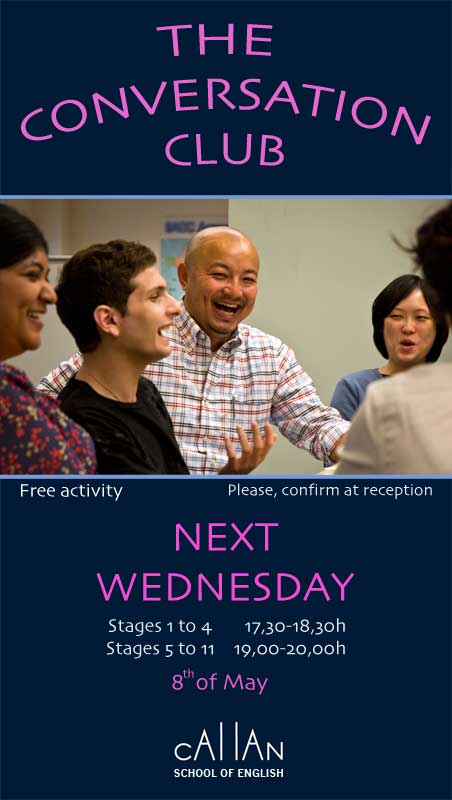La Academia de Inglés, Callan Barcelona, se complace en invitarle a participar en «The Conversation Club» el miércoles 8 de mayo.
