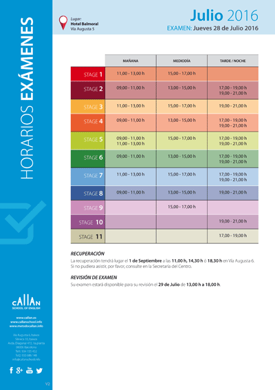 Облигации будут отправлены по электронной почте. Чтобы просмотреть экзамен может сделать это в пятницу 29 июля с 13.00 до 18.00 ч. В том случае, если не сдать экзамен, тест восстановления будет проходить с 1 сентября, в центре Via Augusta, в следующих случаях :. 11.00 час, 14.30 час. и 18.30 ч.